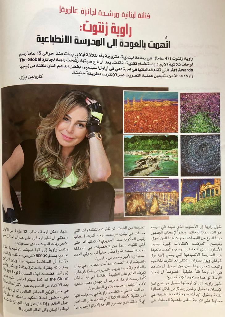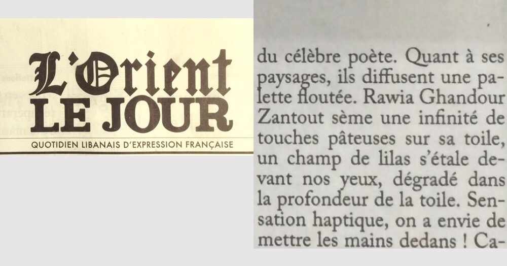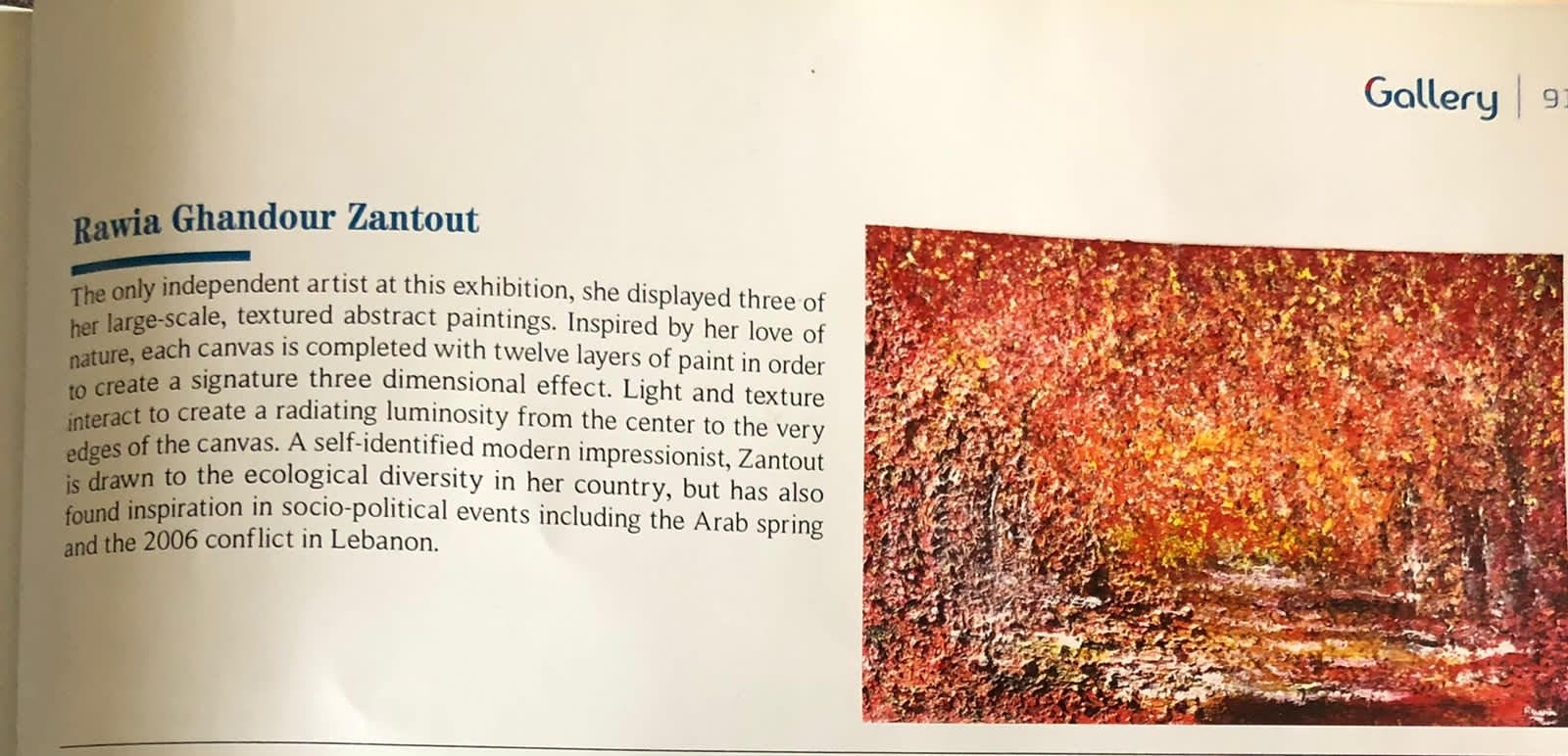 Rawia has participated in many exhibitions in Lebanon and abroad and has received several awards. Her recent exhibitions include a collective exhibition at les Plumes Gallery, Beirut, and a collective exhibition at Sursok Museum, Beirut. She was also selected as a finalist for the Global Art Award in Dubai in 2018.