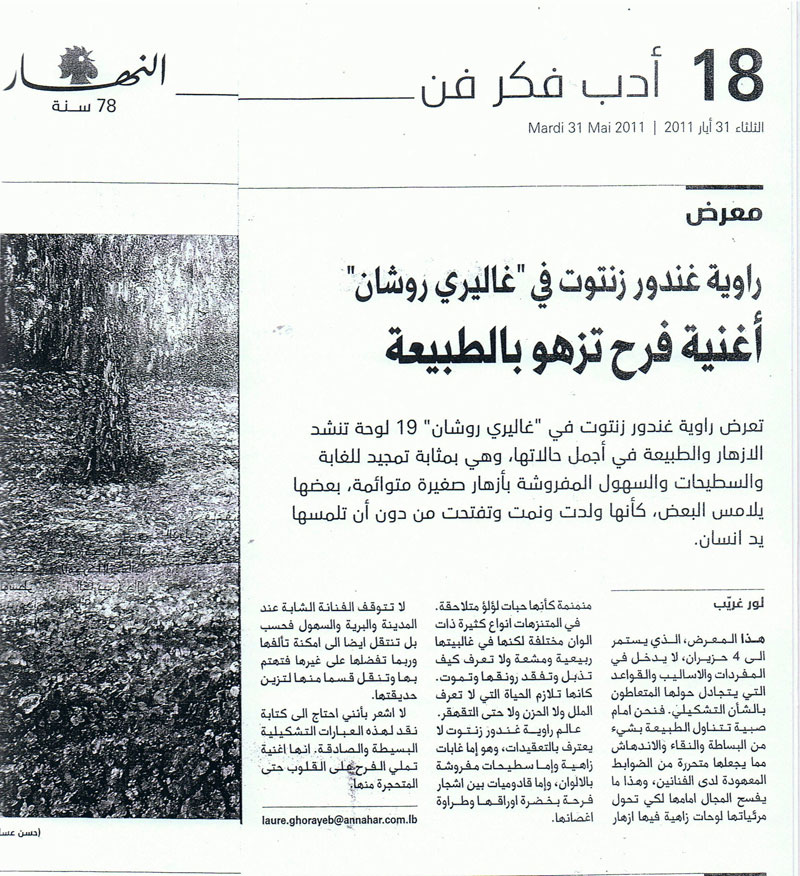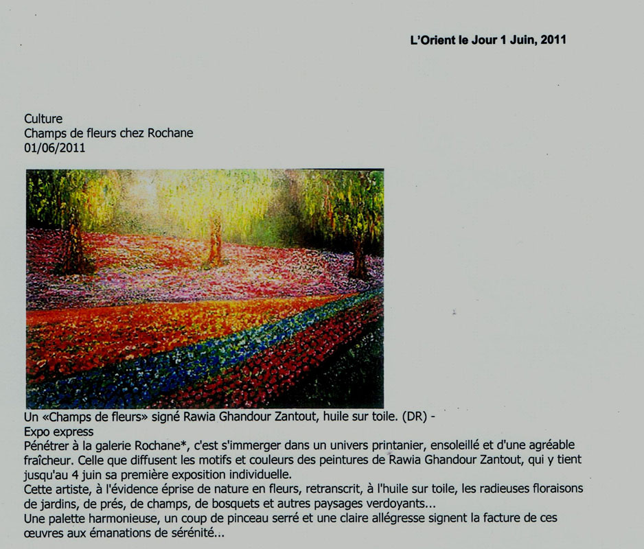 2011: Individual exhibition,"Jardins et fleurs" Galerie Rochane, Saifi Beyrouth. Lebanon