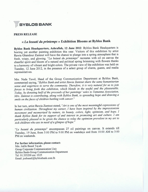 2012 - Byblos Bank Exhibition. Beirut, Lebanon "La Beaute du Printemps" Beirut, Lebanon